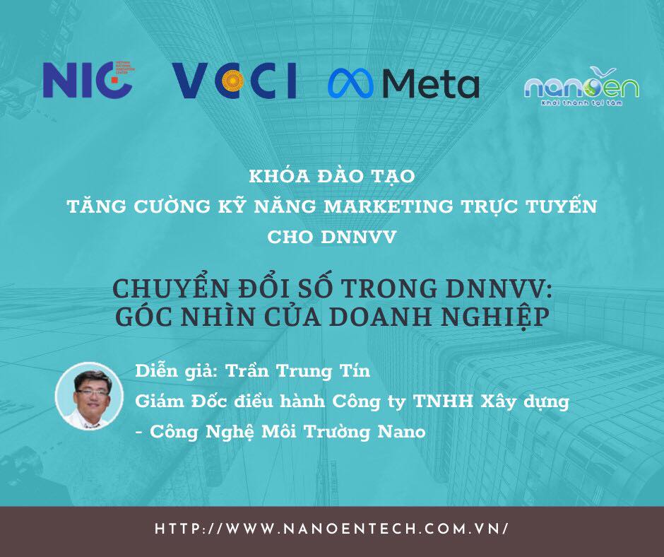 Nanoen - Khóa học trực tuyến “TĂNG CƯỜNG KỸ NĂNG MARKETING TRỰC TUYẾN CHO DNNVV” với hai chủ đề “Chuyển đổi số trong DNNVV: Góc nhìn của chủ doanh nghiệp” và “Sáng tạo nội dung trong tiếp thị doanh nghiệp” được tổ chức vào ngày 05 tháng 10 năm 2022. Thực hiện bởi Trung Tâm Hỗ Trợ Doanh Nghiệp Vừa và Nhỏ, Phòng Thương Mại và Công Nghiệp Việt Nam (VCCI) hợp tác với Tập Đoàn Meta, Trung Tâm Đổi Mới Sáng Tạo Quốc Gia NIC, Bộ Kế Hoạch Đầu Tư, Trung Tâm Đào Tạo Doanh Nhân Khu Vực ĐBSCL.